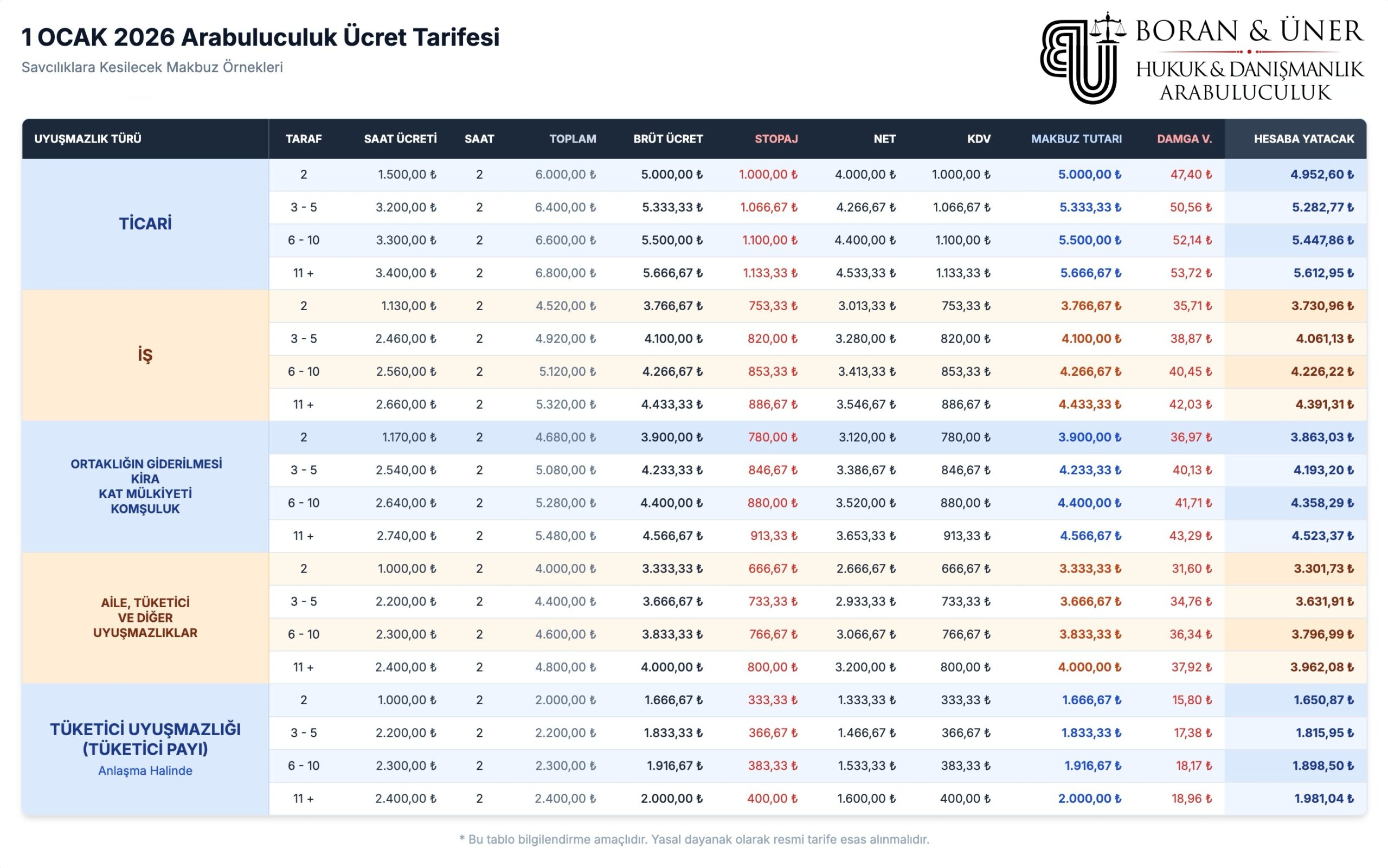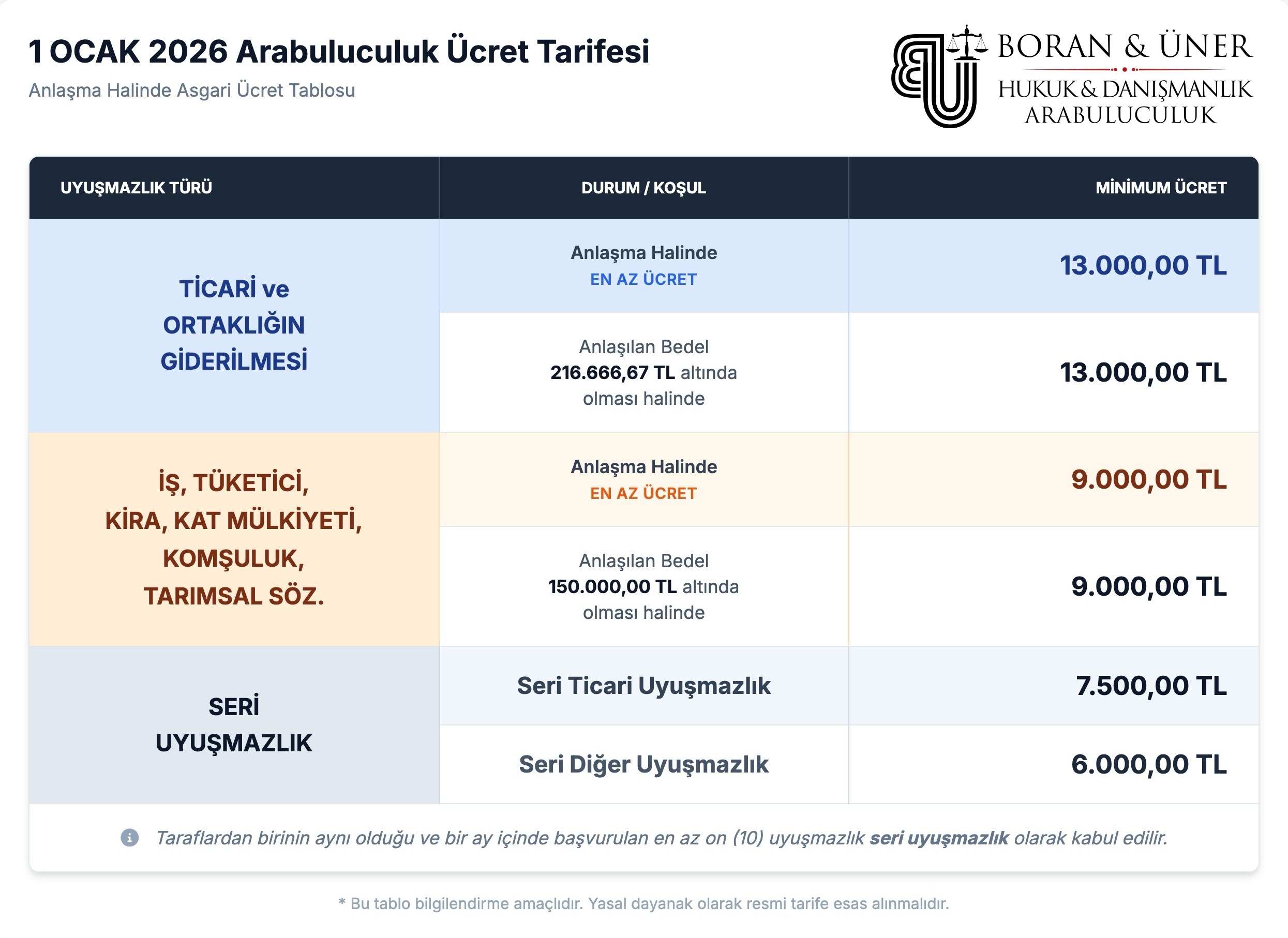 Not: Tablolarda yer alan tutarlar asgari (taban) tutarlar olup, her uyuşmazlığın niteliğine, harcanan mesaiye ve anlaşmaya göre farklılık gösterebilir.